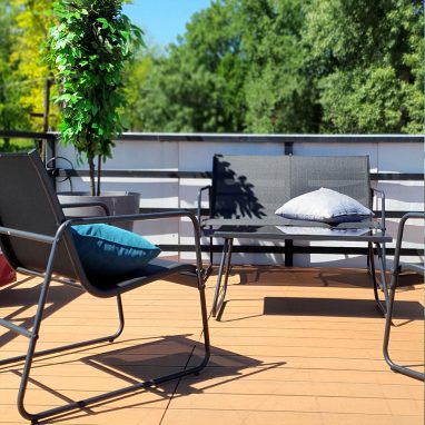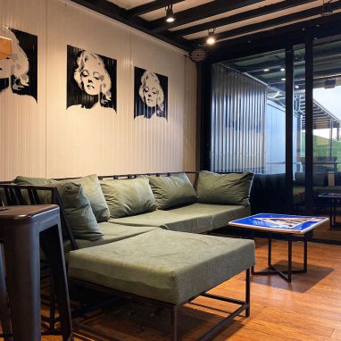 Terase se nadovezuju jedna na drugu kroz tri nivoa: na prvom nivou je terasa sa udobnom ugaonom garniturom, na drugom terasa sa garniturom i šankovima, i na trećem krovna terasa sa garniturom i foteljama i otvorenim pogledom na Beograd. Osim terasa, splav ima svoj toalet i zatvorenu dnevnu zonu.