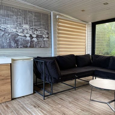 Na donjem nivou su kuhinja, šankovi i ugaona garnitura sa pripadajućom terasom opremljenom baštenskim nameštajem i ljuljaškom, a na srednjem nivou je ugodna dnevna soba sa malom rashladnom vitrinom i televizorom na koje se nadovezuje ušuškana terasa sa izlazom na krovnu.